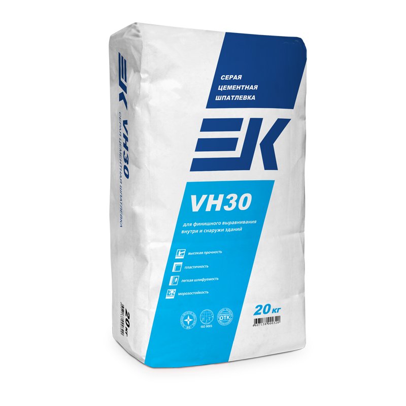 Цементная шпатлевка ЕК VH30 предназначена для выравнивания фасадов, а также водостойких оштукатуренных, бетонных, кирпичных, газобетоных оснований под покраску снаружи и внутри зданий и оклейку обоями.