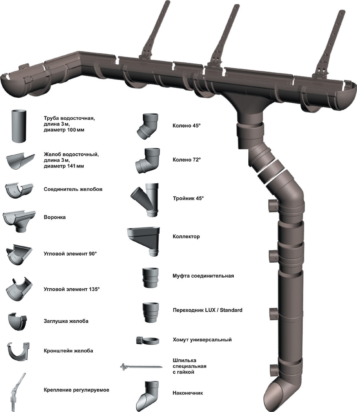 Dоcke LUX предназначена для объектов с большой площадью кровли. Система разработана немецкими инженерами с учетом опыта эксплуатации водостоков предыдущих поколений и вобрала в себя все лучшие инженерные и дизайнерские идеи, применяемые в этой сфере. Имеет усиленную прочность всех элементов и больший диаметр труб.